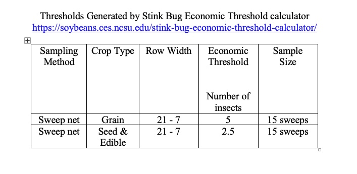 I have included the thresholds for corn earworm and stink bugs below. We have copies of a publication, “Soybean Insect Guide” at our office with the color pictures and information on the important soybean insects for our state. If you would like a copy, please contact us.